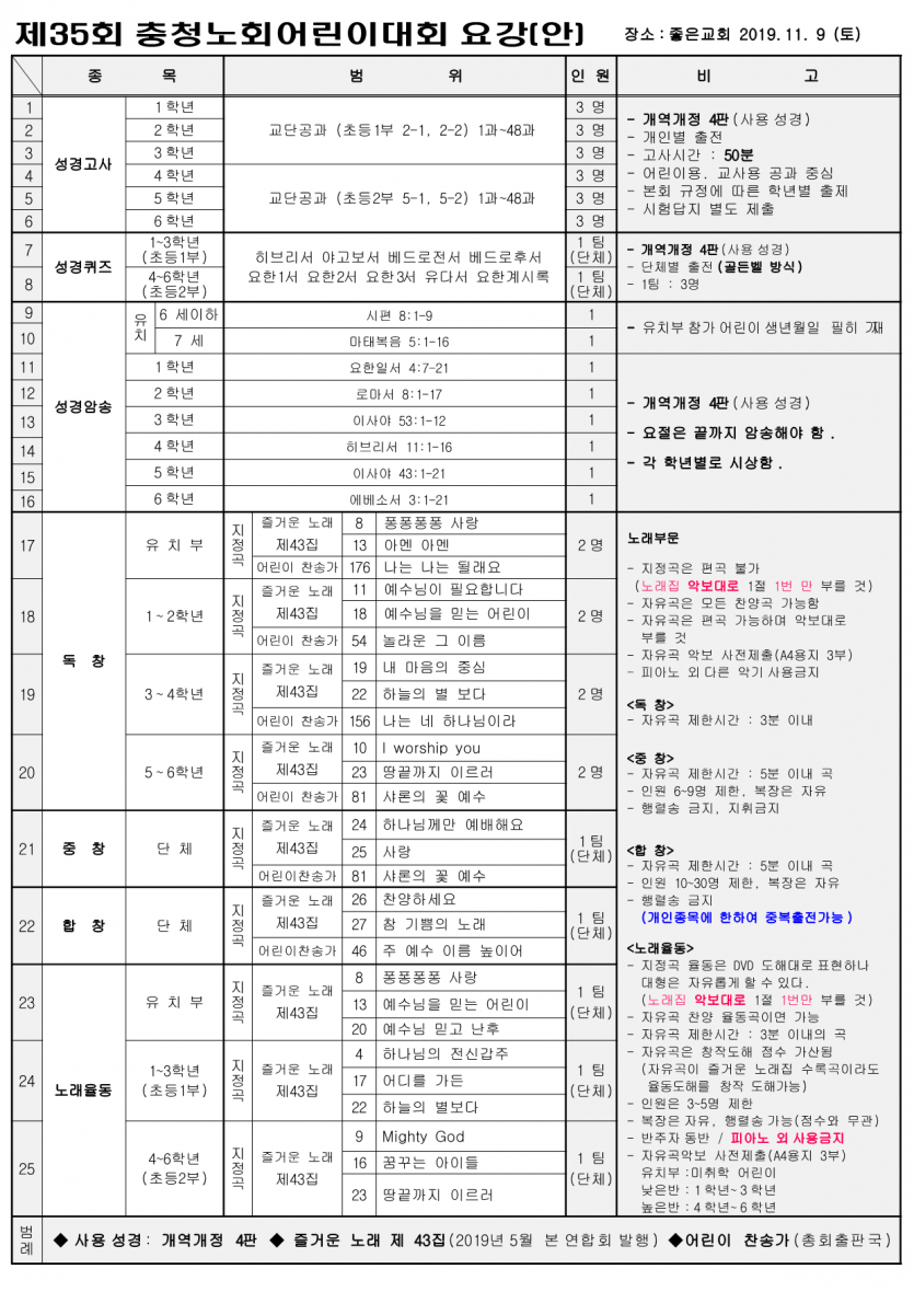 제35회 충청노회 어린이대회 개최요강 및 심사기준 충청노회 어린이대회 0 4161 2019.10.05 22:41 2019.10.05 22:41 어린이대회 개최요강 및 심사기준.pdf (114.9K) + 5 이미지를 클릭하면 더 선명하게 보실 수 있으며,위 PDF 파일을 다운로드 받으시면 인쇄가 가능합니다.