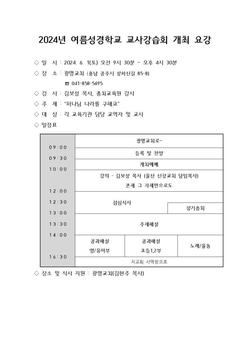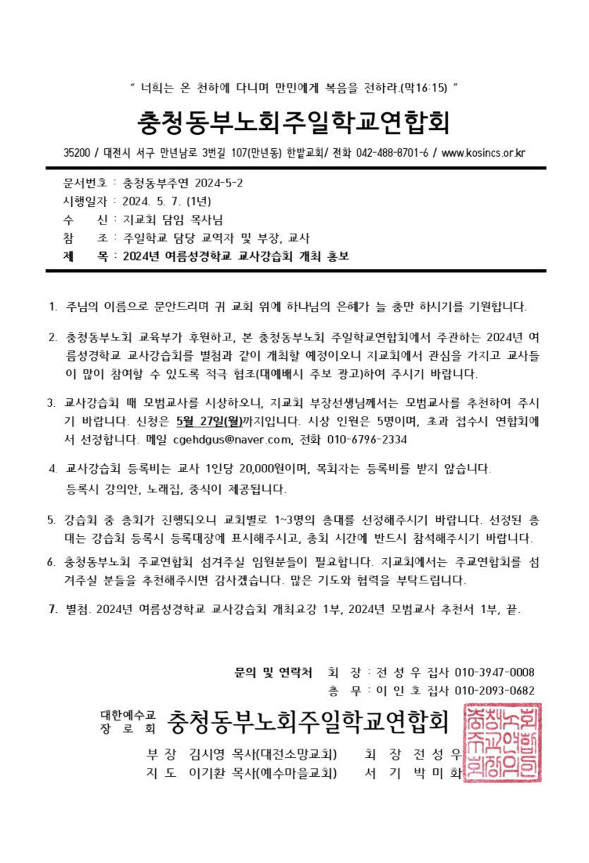 2024년 충청동부노회 여름성경학교 교사강습회 안내 swturtlei 0 869 2024.05.08 16:20 샬롬~ 사랑하는 주일학교 교사 및 교역자님들을 환영하며, 초청합니다.제40회 여름성경학교 교사강습회가 아래와 같은 내용으로 진행되오니 많은 참여를 부탁드립니다.감사합니다.모범교사 신청 : cgehdgus@naver.com