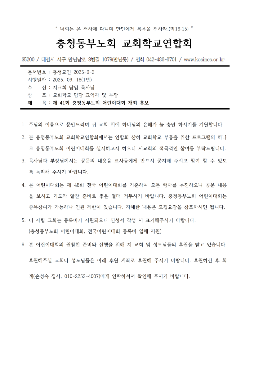 2024년 충청동부노회 여름성경학교 교사강습회 안내